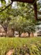 На участке посажены деревья и есть фонтан, дом огорожен забором.
