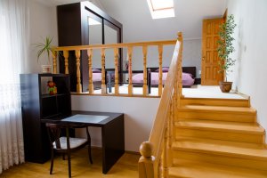 Номер в 2-х уровнях с собственным санузлом с джакузи и кондиционером. Роскошная большая кровать на 2-м уровне и оборудованное рабочее место с небольшой библиотекой — на 1-м. Хостел европейского уровня в центре Краснодара.